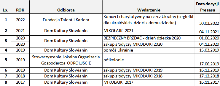 - Proszę o wskazanie w okresie ostatnich 5 lat wszystkich darowizn i umów sponsoringowych zawartych przez spółkę.